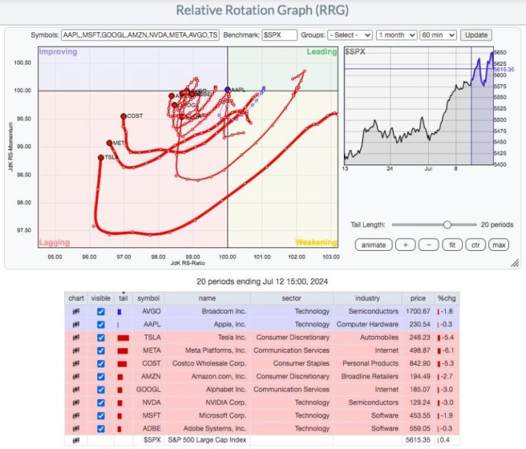 It was a very interesting week indeed. All-time high records continued to fall on a daily basis, but the complexion of the market most definitely changed during the latter part of the week. First, I want to pull up an hourly RRG chart to track 10 key growth stocks, most of which have carried the overall S&P 500 higher throughout 2024: