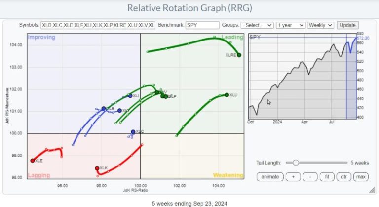 The Materials sector has a similar setup to Industrials. The price has also broken to new highs, albeit slightly later. The relative strength series of lower highs and lower lows is still in place, but the RRG lines are both moving higher, pushing the tail further into the improving quadrant toward leading.