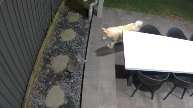 Home security video captured the moment they locked eyes in a suburban backyard surrounded by a high metal fence.