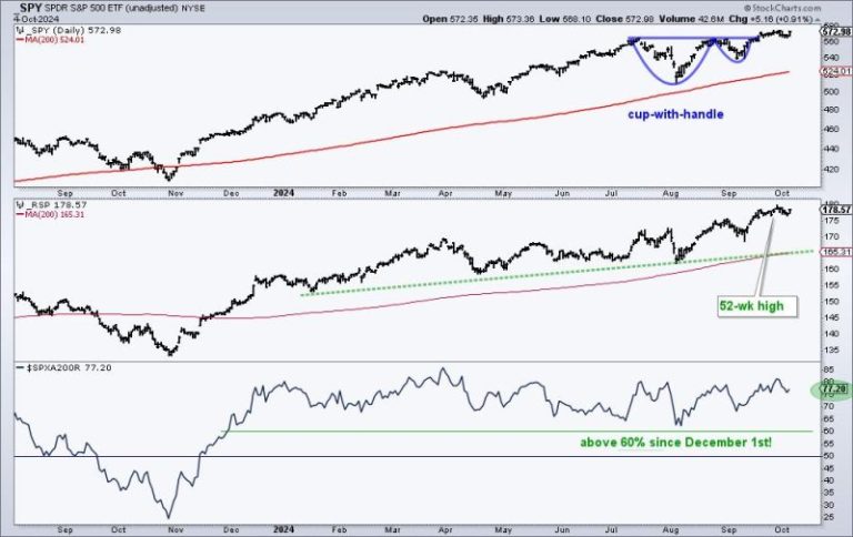 It is a bull market for stocks. On the chart below, the S&P 500 SPDR (SPY) recently broke rim resistance of a cup-with-handle pattern and is trading near a 52-week high. The S&P 500 EW ETF (RSP) recorded a new high in late September and is leading the market since July as the bull market broadened. Moreover, over 75% of S&P 500 stocks are trading above their 200-day SMAs.