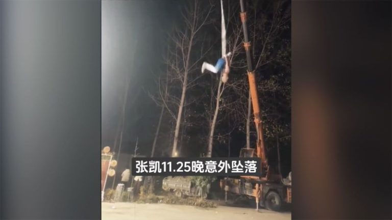Zhang Kai, 39, plunged several meters to a hard cement ground while performing an aerial silks routine on Monday night, after two pieces of fabric he was holding broke loose from the top of a crane.