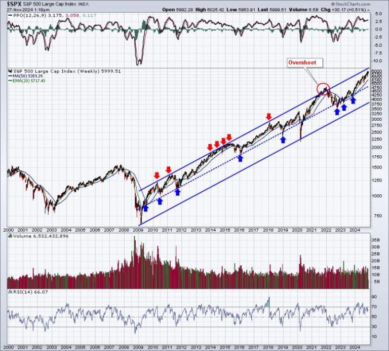 Notice that those tests of the blue-dotted “middle” upslope line are excellent opportunities to jump in for what’s likely to follow – a strong uptrend to return back to the upper channel line.