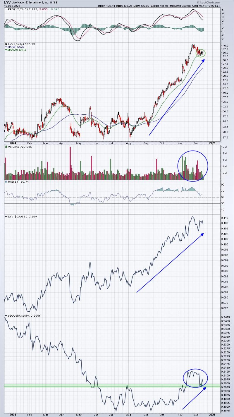 There’s a lot to like here as LYV’s industry group – broadcasting & entertainment ($DJUSBC) – is now showing much better relative strength to the S&P 500. In other words, money is rotating INTO the entertainment area and, as an industry group leader, LYV is reaping the rewards. The early-December selloff has taken LYV out of overbought territory on its RSI and allowed it to test its rising 20-day EMA, setting up for a bounce.