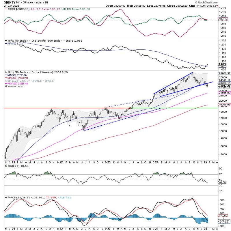 The pattern analysis of the weekly charts shows that the Nifty is now decisively below the 50-week MA at 23711. This means the key resistance level has been dragged lower to this point, even from a medium-term horizon. As evidenced on the chart, while the Nifty breached the 50-week MA, it also slipped below the support of the rising trend line pattern.