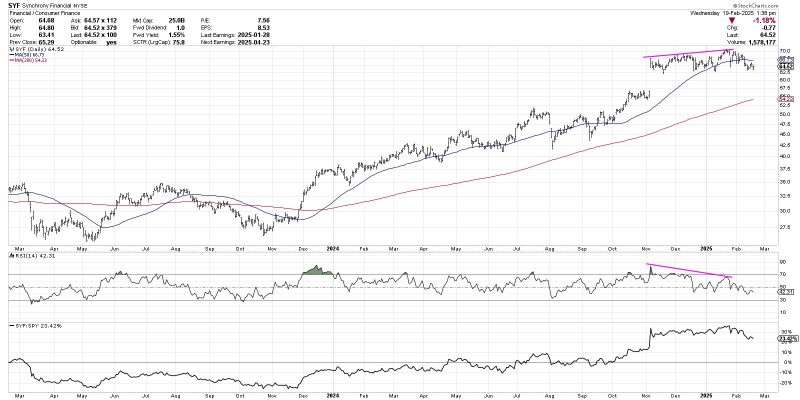 While I could share my chart of the S&P 500, or perhaps Alphabet (GOOGL) which featured a bearish momentum divergence going into its recent high, I’ll go with the daily chart of Synchrony Financial (SYF). Here we can see a clear pattern of higher highs in price from November 2024 through February 2025. But note how the RSI is sloping lower during this period.