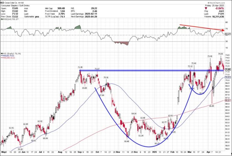The safe trade in KO has lost momentum on each rally, as seen in the lower highs of its relative strength index (RSI). This bearish divergence is cause for concern as price hits a crossroads into earnings.