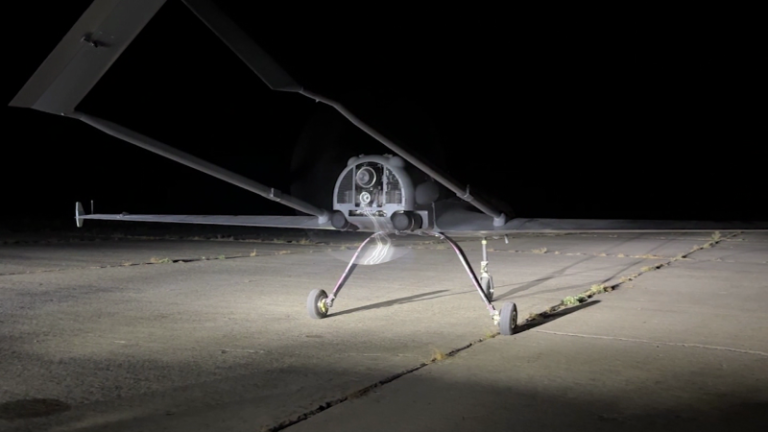 The spluttering roar of a propeller punctuates the perfect silence. Car headlights flick on, splitting the darkness. Their beams reveal not just a section of tarmac ahead, but one of Ukraine’s most top-secret weapons, controlled by its most clandestine agency. Stuck to the nose of the gray machine is a…
